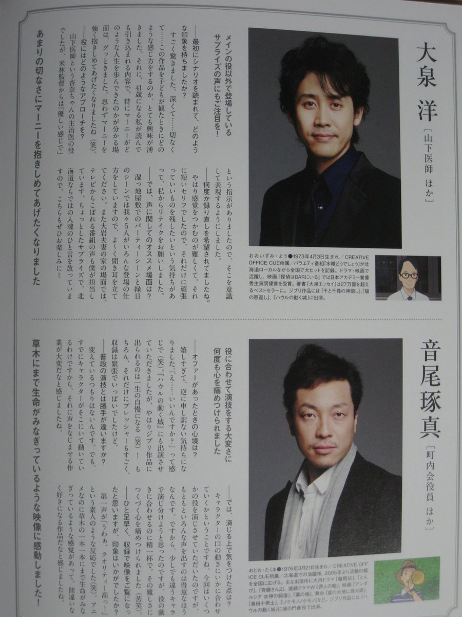 山下医師の声は大泉洋さん。今作は北海道が舞台ということで、大泉さんも在籍している"TEAM NACS"の5人が出演されています。森崎博之さんは美術教師、安田顕さんは十一、戸次重幸さんはマーニーの父、音尾琢真さんは町内会役員をそれぞれ担当。