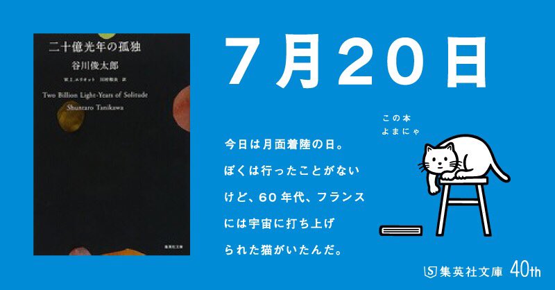 【 #日めくりよまにゃ 】毎日よまにゃがオススメの本を紹介!今日は #月面着陸の日。「 #二十億光年の孤独 」をよまにゃ! goo.gl/QXj6tH