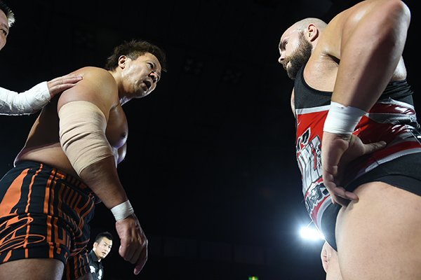 会場はエルガン&オカダの大コール!!エルガン @MichaelElgin25 vs オカダ @rainmakerXokada …勝利を掴むのは?!