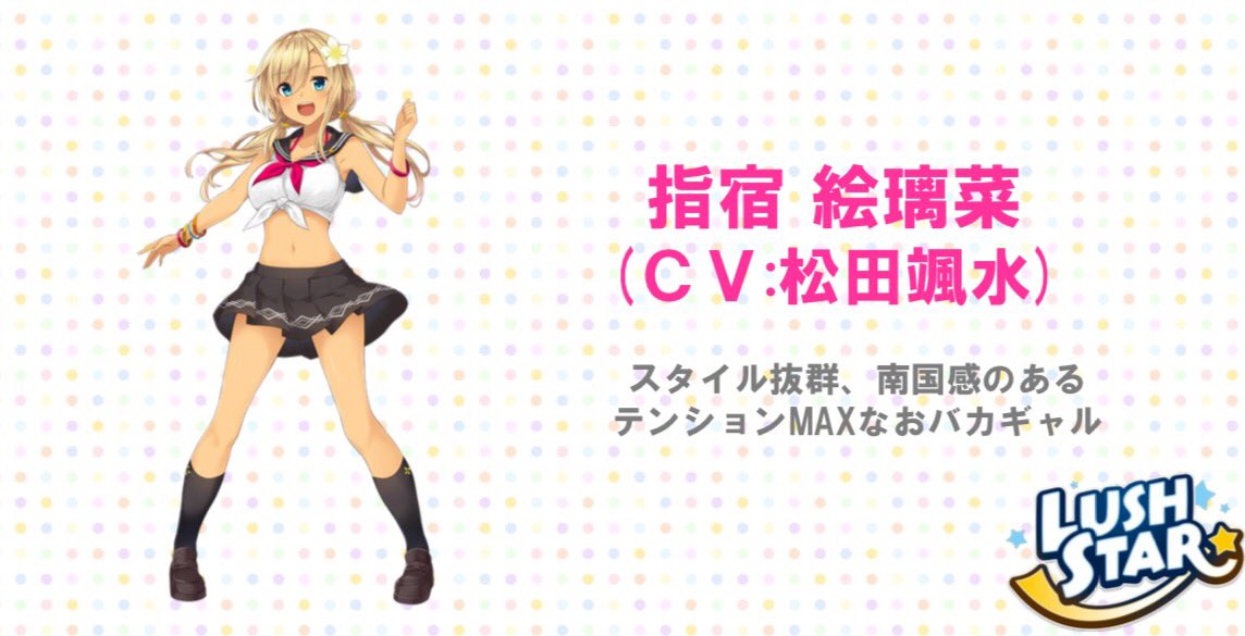 「LUSH STAR☆」のメンバー最後の5人目は、指宿絵璃菜(CV:松田颯水)です!