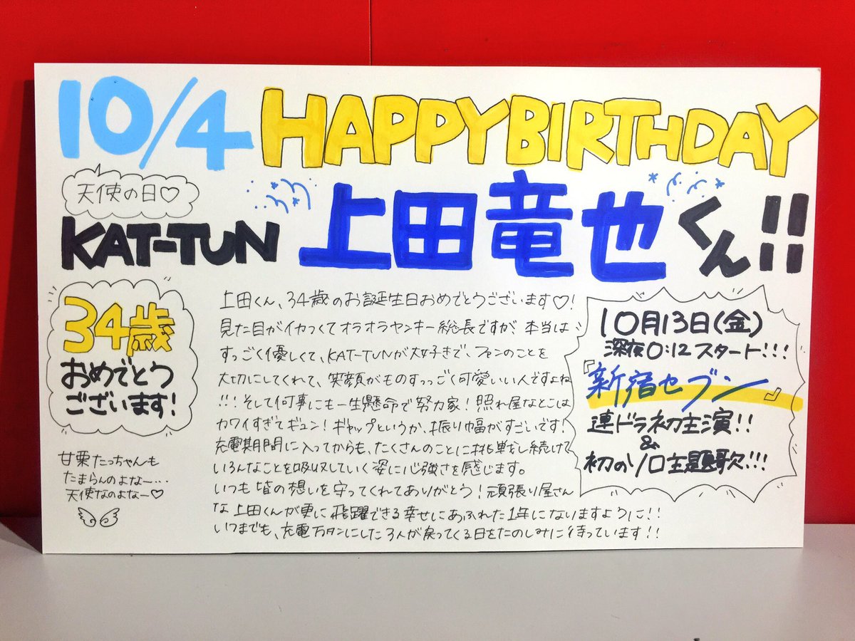 【KAT-TUN】本日10/4は #上田竜也 くんのお誕生日です🎂13日(金)から主演ドラマ「 #新宿セブン 」が始まります!主題歌もドラマも楽しみですね~~!!!上田くんにとって素敵な一年となりますように。タワ崎はこれからも応援しています!(森) #祝上田竜也34歳 #天使の日 pic.twitter.com/lKvRsCpp5Z