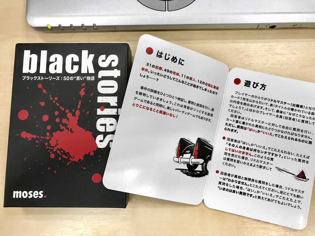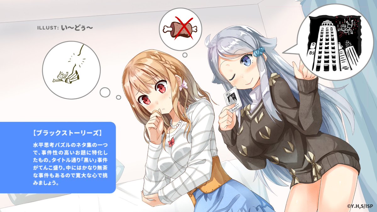 ちなみに【1話エンドカード】1/3。本作アイキャッチとエンドカードは作中のキーアイテムがテーマです。1話のエンドカードは、水平思考パズルのネタ集black storiesを扱った絵を、妹さえコミカライズ版の著者・い~どぅ~さん @fenalkunに描いて頂きました! #imosae pic.twitter.com/SYI3EVl5NM