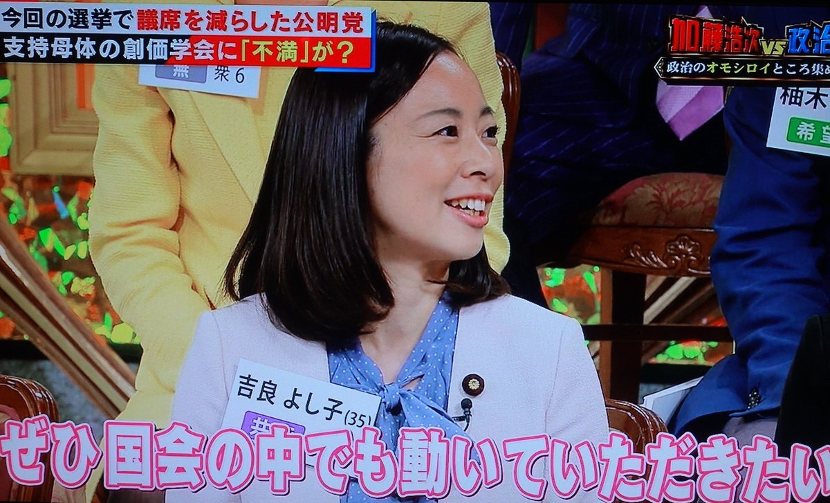 フジテレビ「加藤浩次VS政治家」公明党の比例票が減っていることが話題になり、「吉良さん、どうですか」と振られてこの発言。ナイスだわ♪