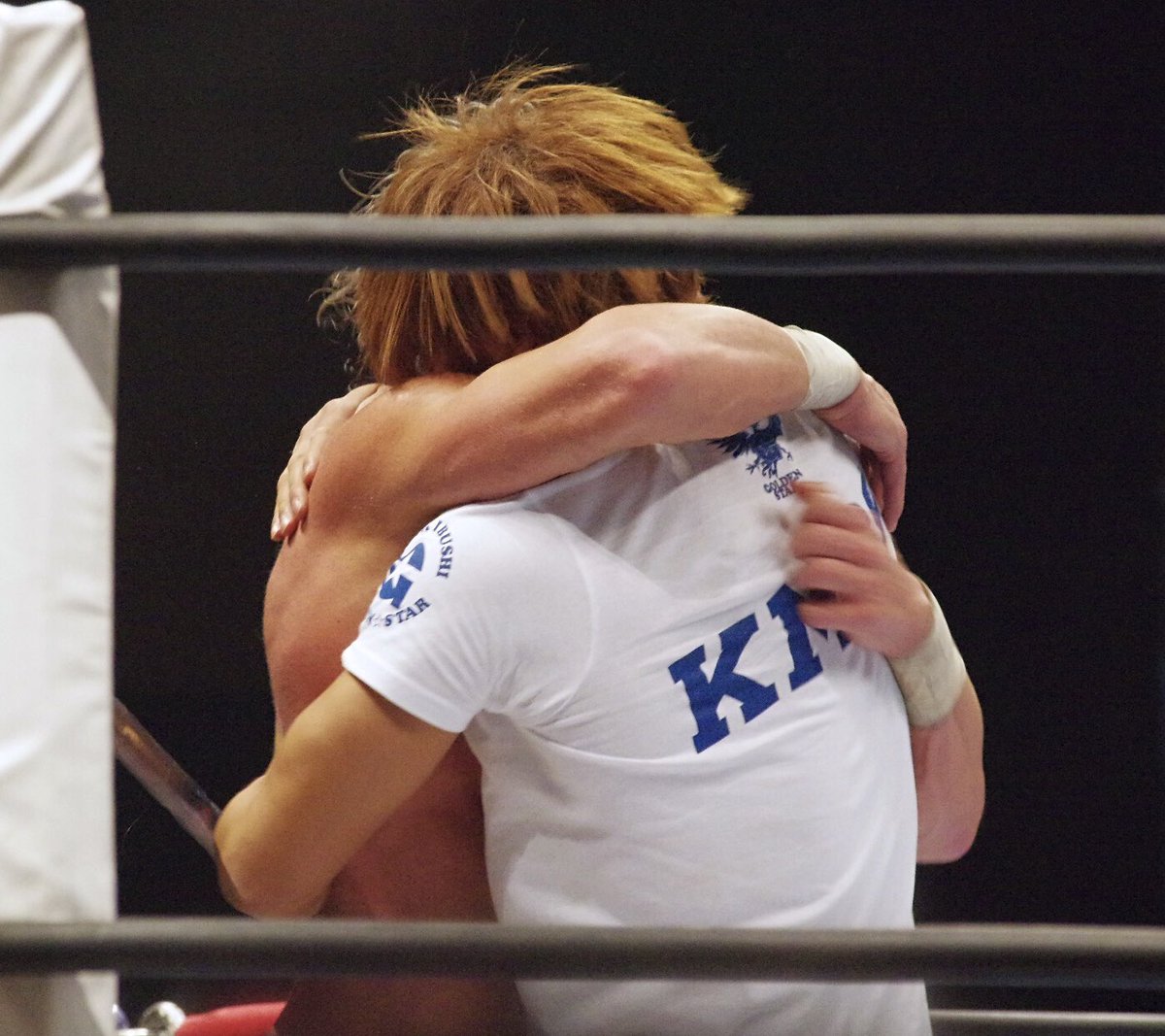 ゴールデンラヴァーズがリングで抱き合ったのは2014年10月26日、 #ddtpro でのドラマチック壮行試合以来、3年3カ月ぶり。ちなみにその日、ケニーがDDT最後の技に選んだのは、片翼の天使でもなく、クロイツラスでもなく、ゴールデンシャワーでした #njpw #njnbg pic.twitter.com/4BgoURfi71