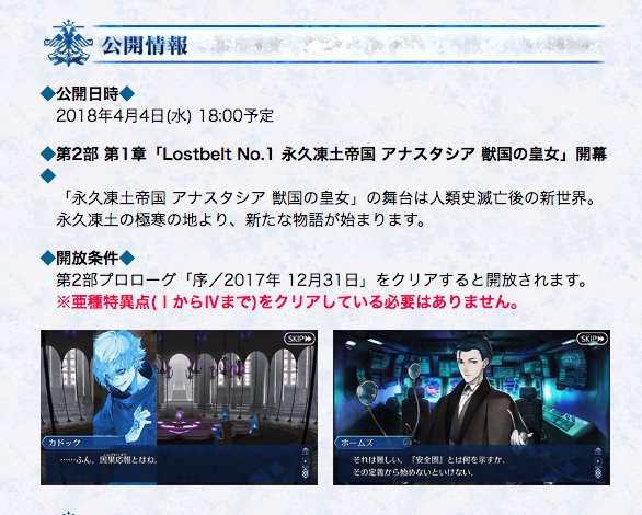 2018年4月4日(水)18:00より、第2部 第1章「Lostbelt No.1 永久凍土帝国 アナスタシア 獣国の皇女」開幕予定!30秒CMや新登場サーヴァントの情報など、詳しくは→ news.fate-go.jp/2018/anastasia/ #FGO pic.twitter.com/dpq7oVWcif