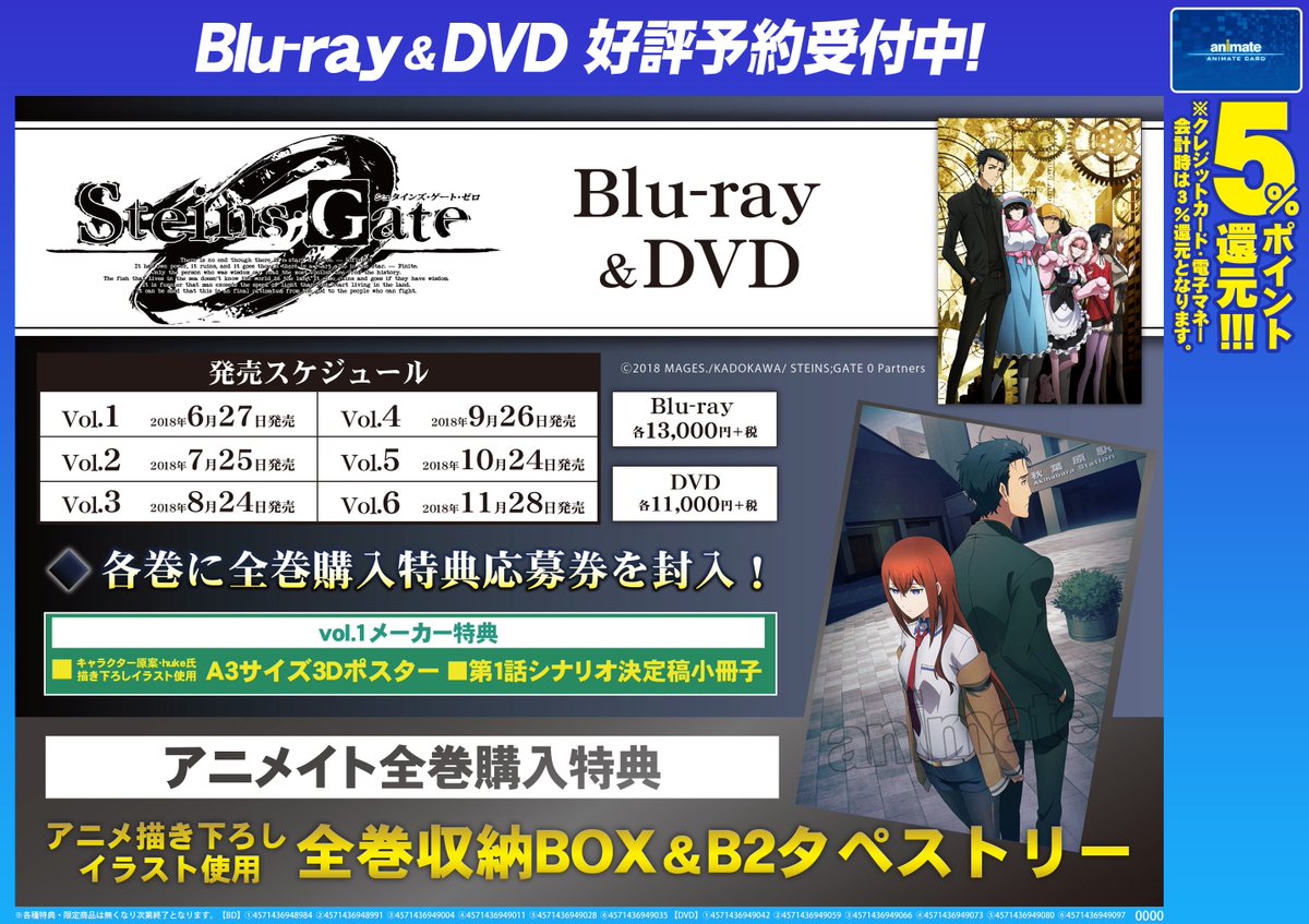 また、ポスタージャックのお店でBD&DVD Vol.1を予約するとキャラポスターを1枚プレゼント!是非遊びにきてください! #シュタゲ pic.twitter.com/bwRviLM9k42018年4月13日 20:07
