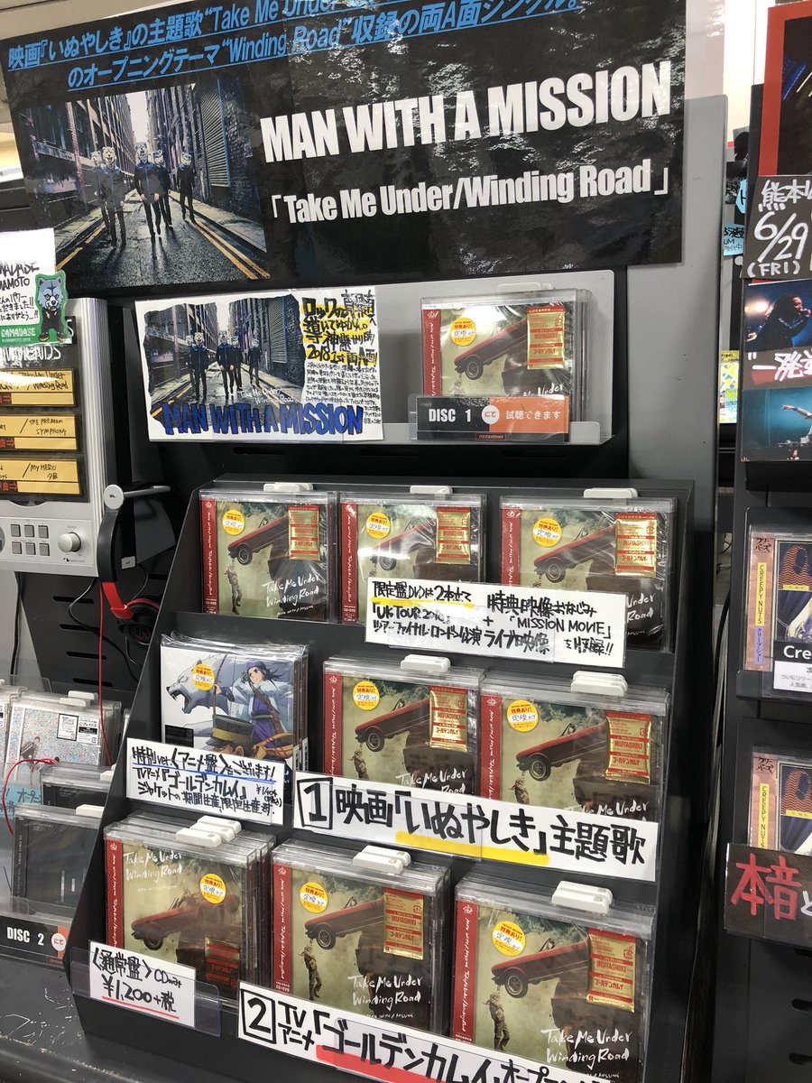 【 MAN WITH A MISSION 】 #マンウィズ 激待望のトリプルタイアップNEWシングル『Take Me Under/Winding Road』入荷‼️最大級の感謝の気持ちを込めて大展開中‼️先着特典は狼定規🐺ガマダセ熊本でもらったたくさんのパワーを次に繋げて2年目もがまだしていきます‼️ #gamadase2018 pic.twitter.com/dC0VLxWdBF