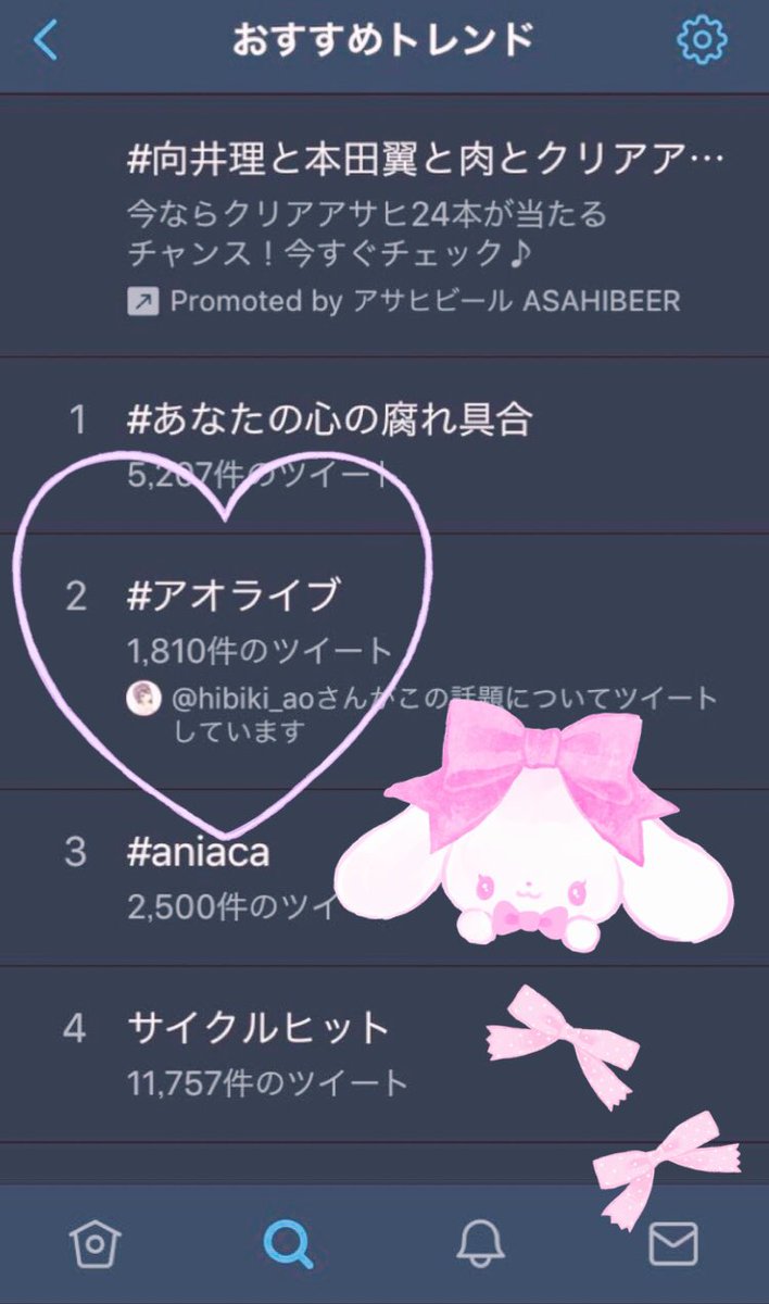 なななななんと! #アオライブ がおすすめトレンドで6位…(ᕯᐤ⌂︎ᐤᕯ)✨ うれしいな~うれしいな~💕 みんなもよければタグつけてツイートしてください🐰🥕💓 pic.twitter.com/v9KlQRX9g6