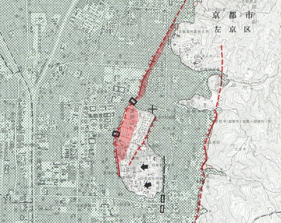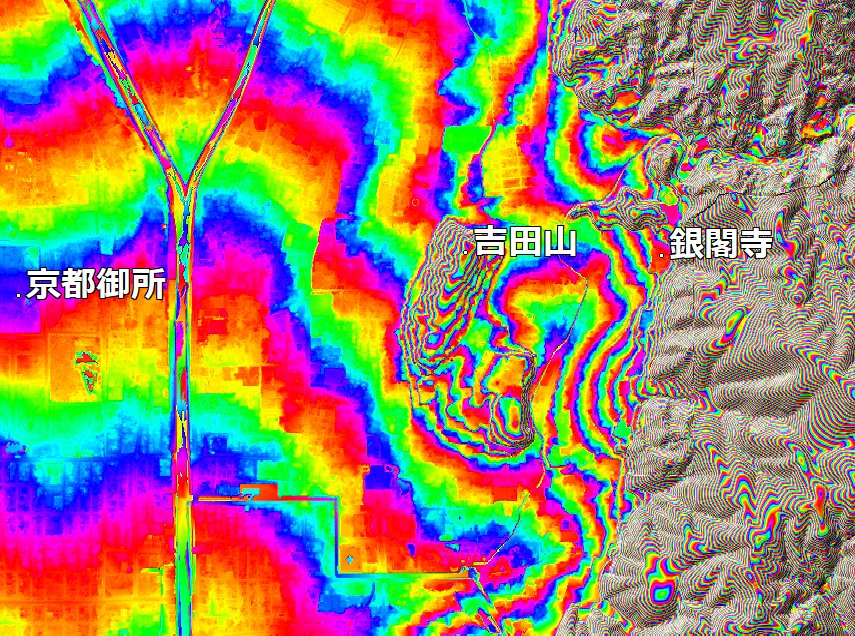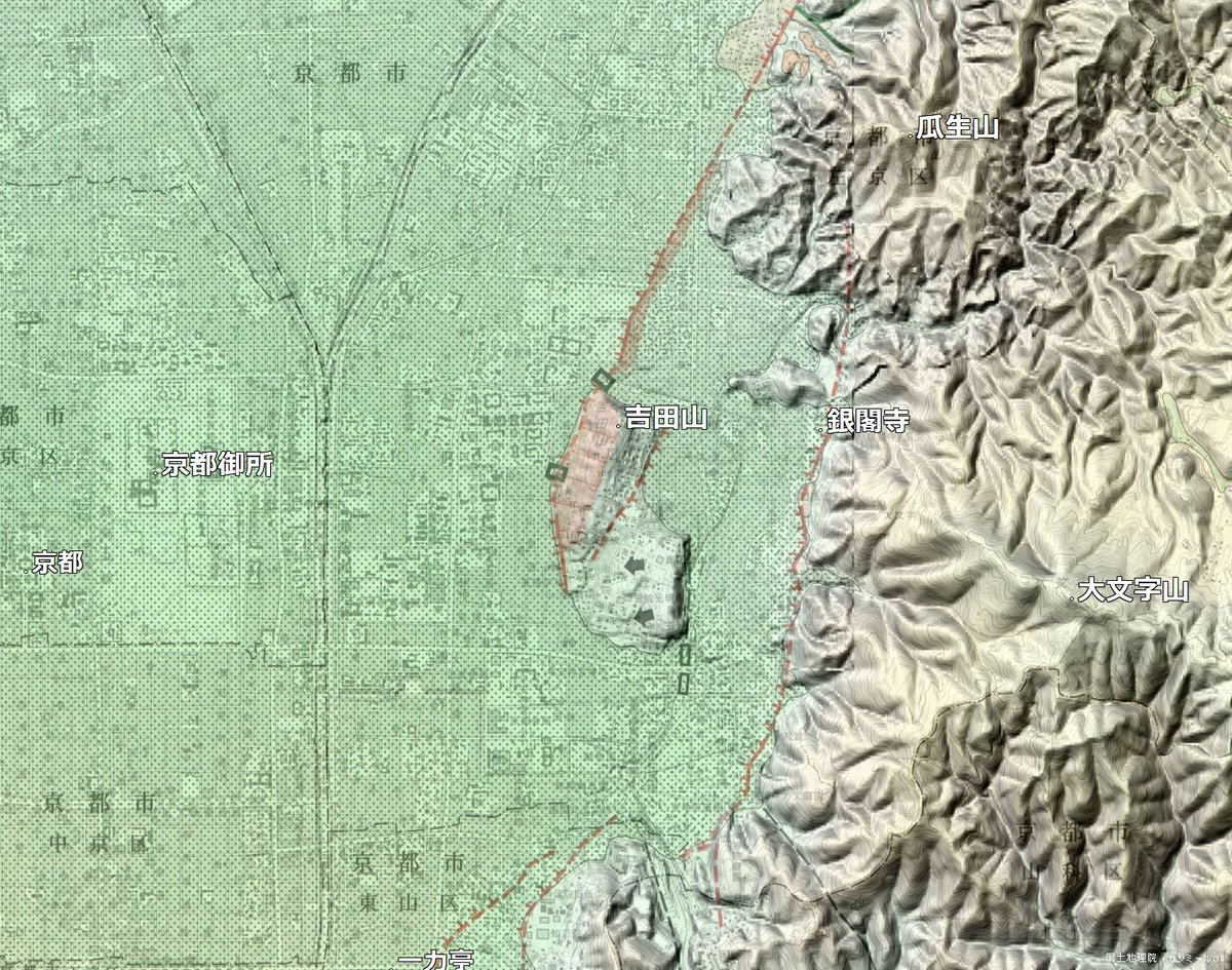『ブラタモリ・銀閣寺編』銀閣寺から京都方面が吉田山に隠されている、というのは面白い視点でした。吉田山は断層末端の末端膨隆丘。都市活断層図でも断層の線が見えますね。1m単位の色分けをしてみると、銀閣寺付近は小さな扇状地になっているようです。スーパー地形セットで。 #ブラタモリ pic.twitter.com/paNxWqFcJg
