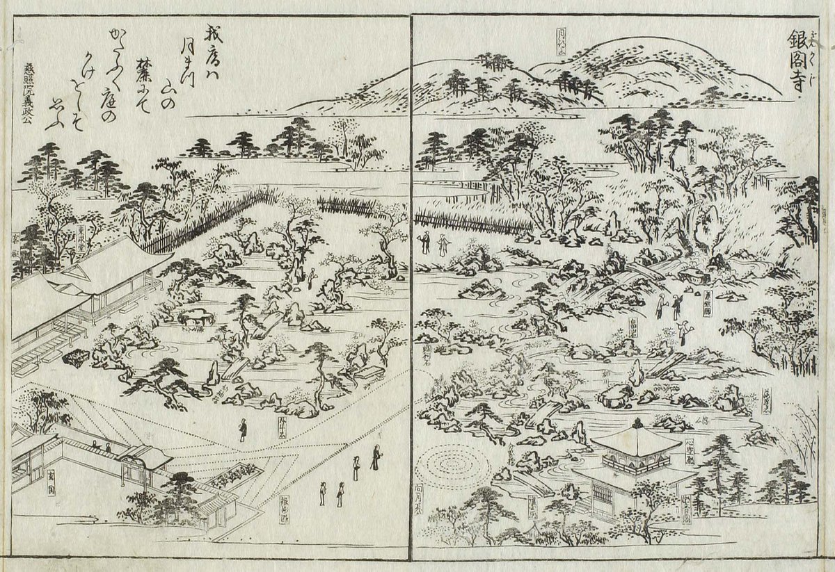 幾何学的な造形が際立つ、まるでモダンアートのような「銀沙灘」と「向月台」。江戸時代のガイドブック「都名所図会」(1780年刊行)には既に描かれていますが、今とは少し形が違いますね。銀閣の上にも、今の鳳凰とは違い、宝珠が載っています。(以倉) #ブラタモリ #実況ツイート pic.twitter.com/kGEUWyoE92