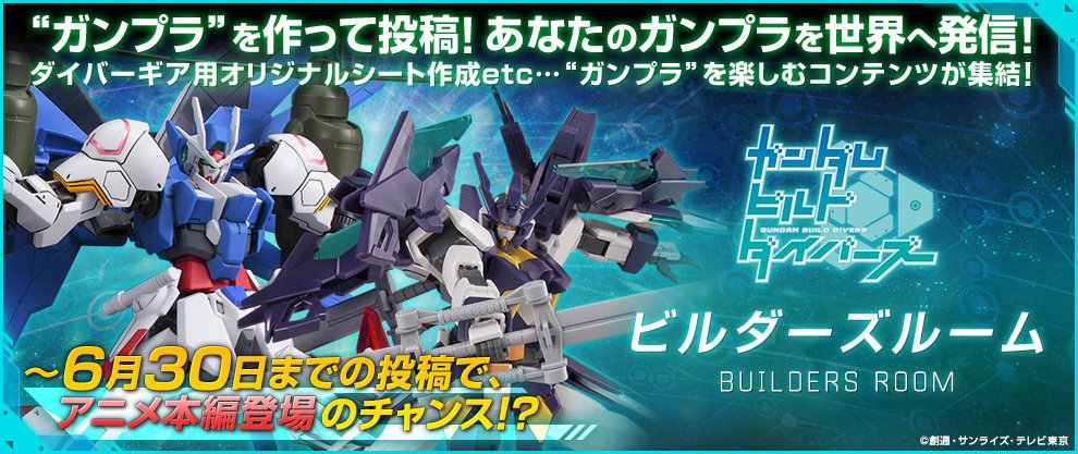 ガンダムビルドダイバーズ ビルダーズルームに新情報!なんと6月30日までにご投稿いただいた作品の中から、「カスタマイズビルドコンテスト」で最優秀賞1名がアニメ本編に登場です!ご応募はこちらから→ bd-p.bandai-hobby.net/member/ #g_bd pic.twitter.com/cBYn00AhQ0