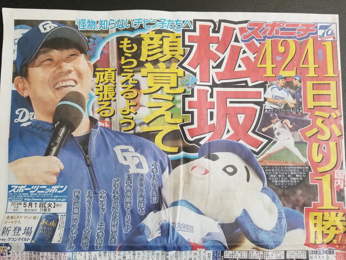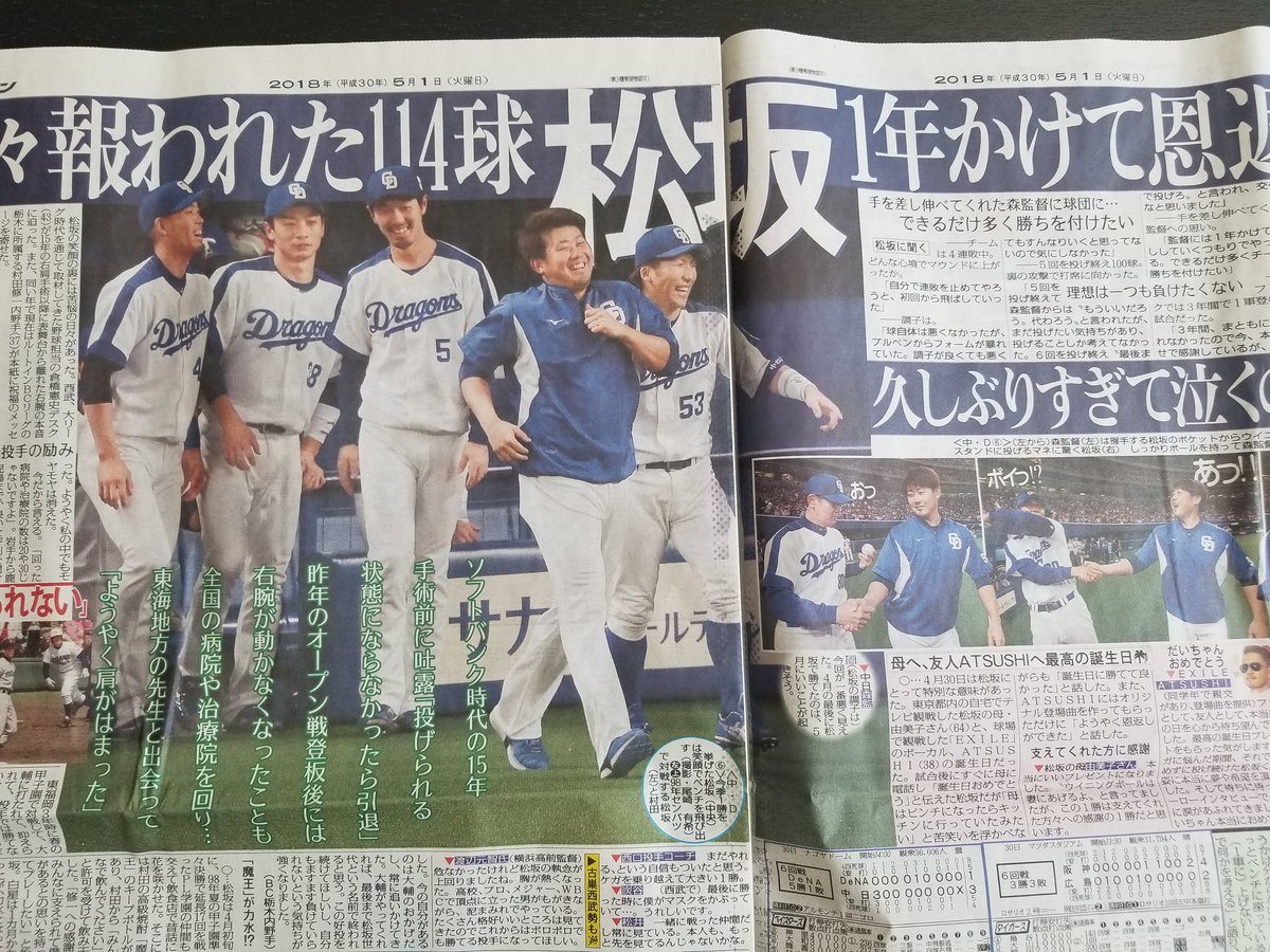 #スポニチ #dragons #松坂大輔 pic.twitter.com/iKeMiHvy3d2018年5月1日 10:54