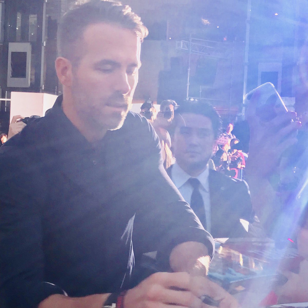 ユウヘイさん @lonely_muscle のウェポンXIに大感激のライアン・レイノルズ氏、過ぎてから再度戻り、自身のカメラでも撮影。