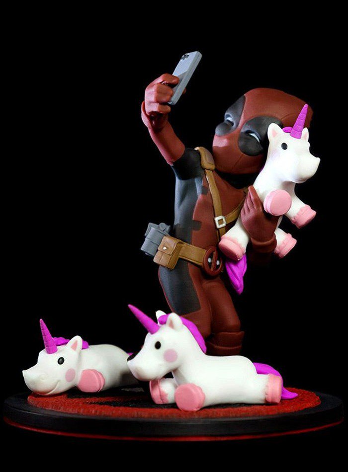 俺ちゃんラバーズのみんなとセルフィー、「 #俺ちゃん来日中 」なデップーの図が早くもフィギュア化となりました。冗談です。クアンタムメカニクスのQポップ新作の #デッドプール でございます。スマホ画面にしっかりとツーショット写真、芸が細かい!