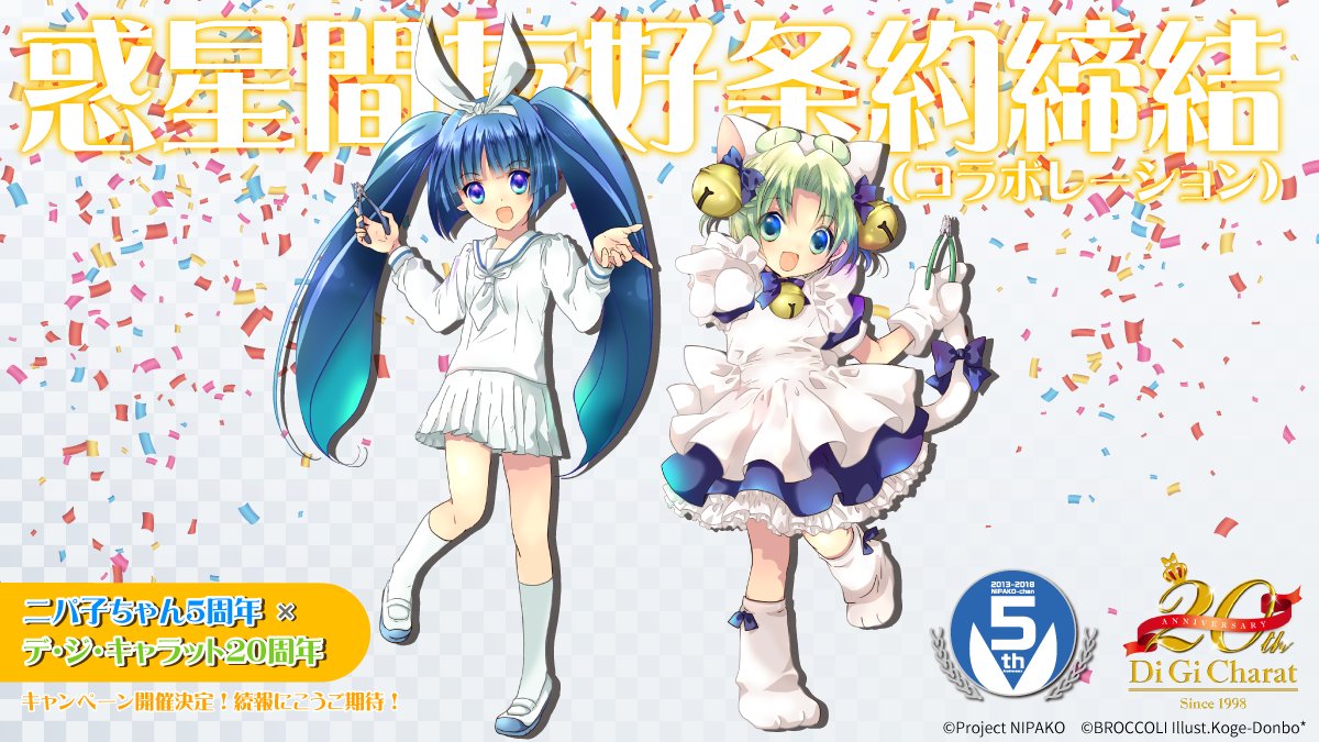 2018年6月28日、ニパ子ちゃん5周年( @godhandtool )とでじこ様20周年を記念した惑星間友好条約締結(コラボレーション)が発表になったにょ!こげどんぼ*先生描きおろしコラボイラストで盛大にお祝いにょ! #ニパ子5周年 #デ・ジ・キャラット20周年