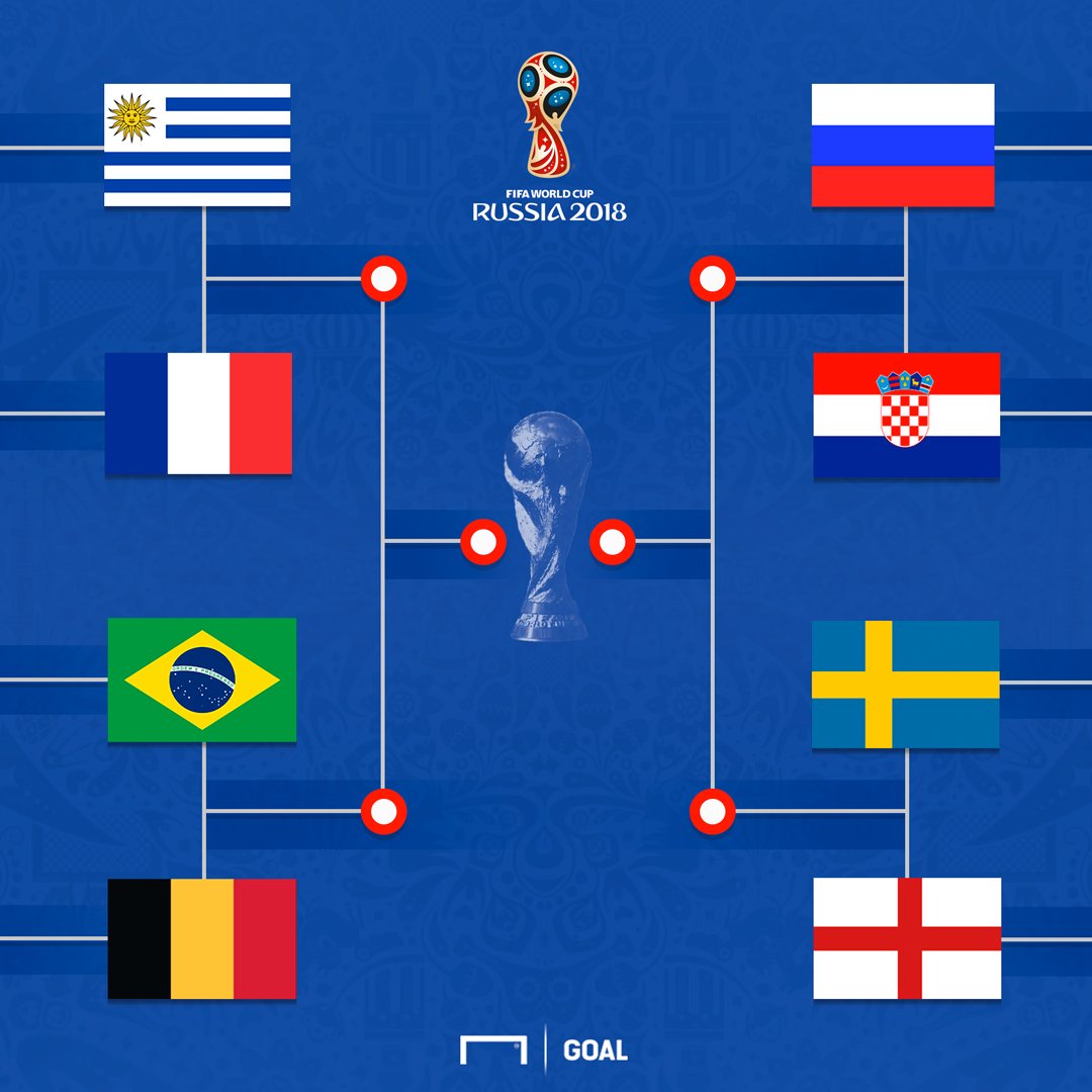 準々決勝の組み合わせは、 #ウルグアイ🇺🇾- #フランス🇫🇷、 #ブラジル🇧🇷- #ベルギー🇧🇪、 #ロシア🇷🇺- #クロアチア🇭🇷、 #スウェーデン🇸🇪- #イングランド🏴に