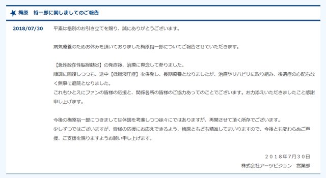 声優・梅原裕一郎が活動再開を発表、「後遺症の心配なく無事に退院」 #梅原裕一郎 news.mynavi.jp/article/201807… pic.twitter.com/OQgD1VLssR