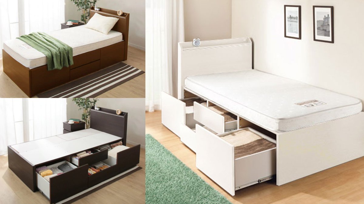 チェストが欲しいけど場所はないひと大歓喜の「チェスト型べッド」!!引出し4杯の大容量チェストをベッドの下にセット♪引出しは左右どちら側にも組替えOK!枕元にはコンセント付きの棚!これで29,900円(税別)~😳
