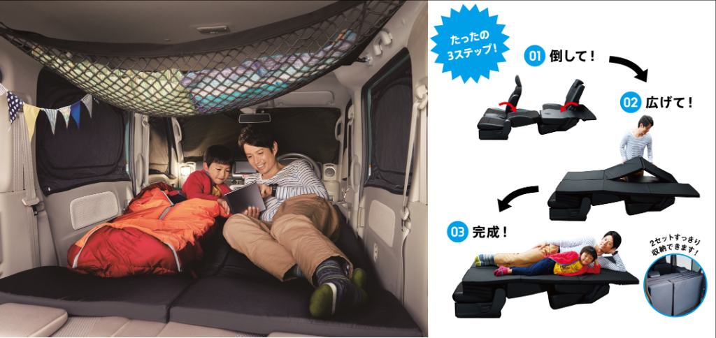 “ベッドクッション” をつかえば、簡単 3ステップ♪で、シートがベッドに早変り!ドライブ先やアウトドアでの #車中泊 もできちゃいます!