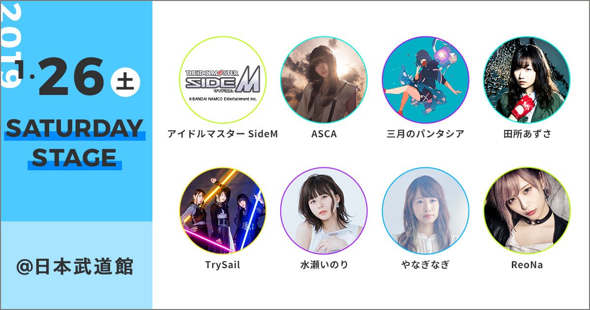 [1/26(土)SATURDAY STAGE]アイドルマスター SideM(仲村宗悟、高塚智人、山谷祥生、菊池勇成、益山武明、深町寿成)/田所あずさ/TrySail/水瀬いのり/やなぎなぎ