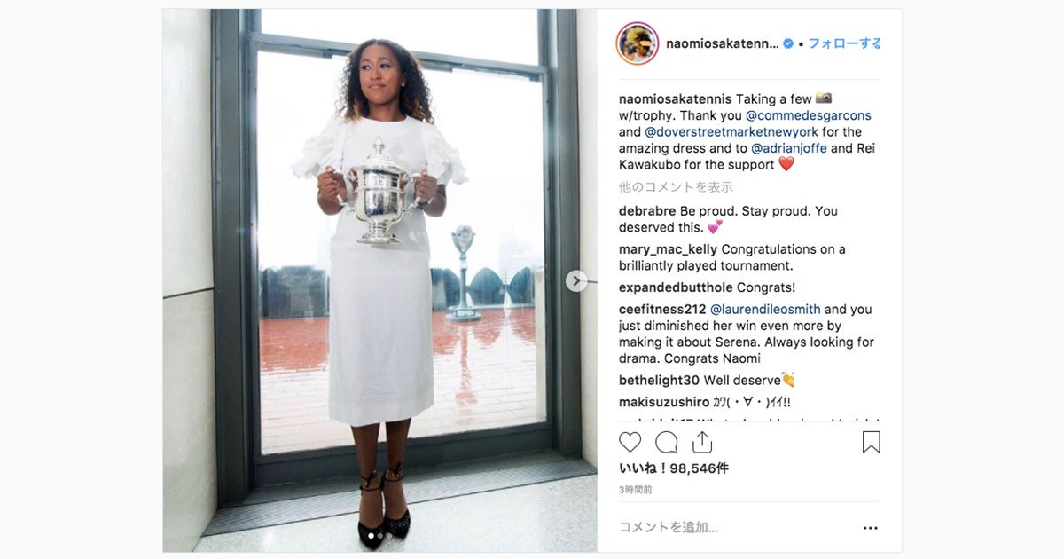 【話題記事】大坂なおみを「コム デ ギャルソン」もお祝い 白いドレスを提供