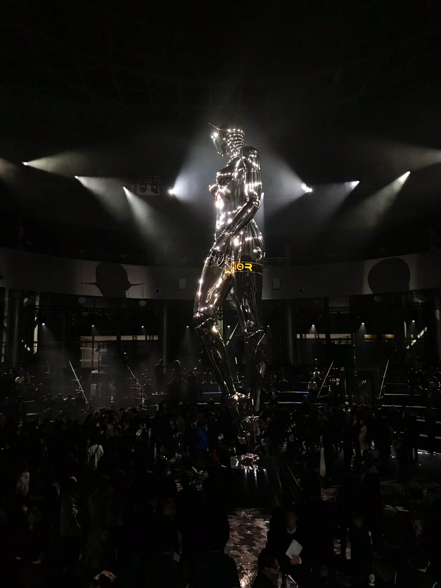 【ライブ配信】ディオールのショー会場より。場所はテレコムセンター。スタート予定時刻が過ぎていますが、まだ客入れが続いているようです。中央のオブジェは空山基の作品。開始までお待ちください。