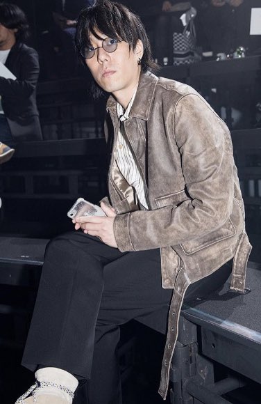 【イベント取材】「ディオール」のショー会場に、RADWIMPSの野田洋次郎さんが来場!ブラウンのジャケットとシューズをマッチさせたスタイリングです。