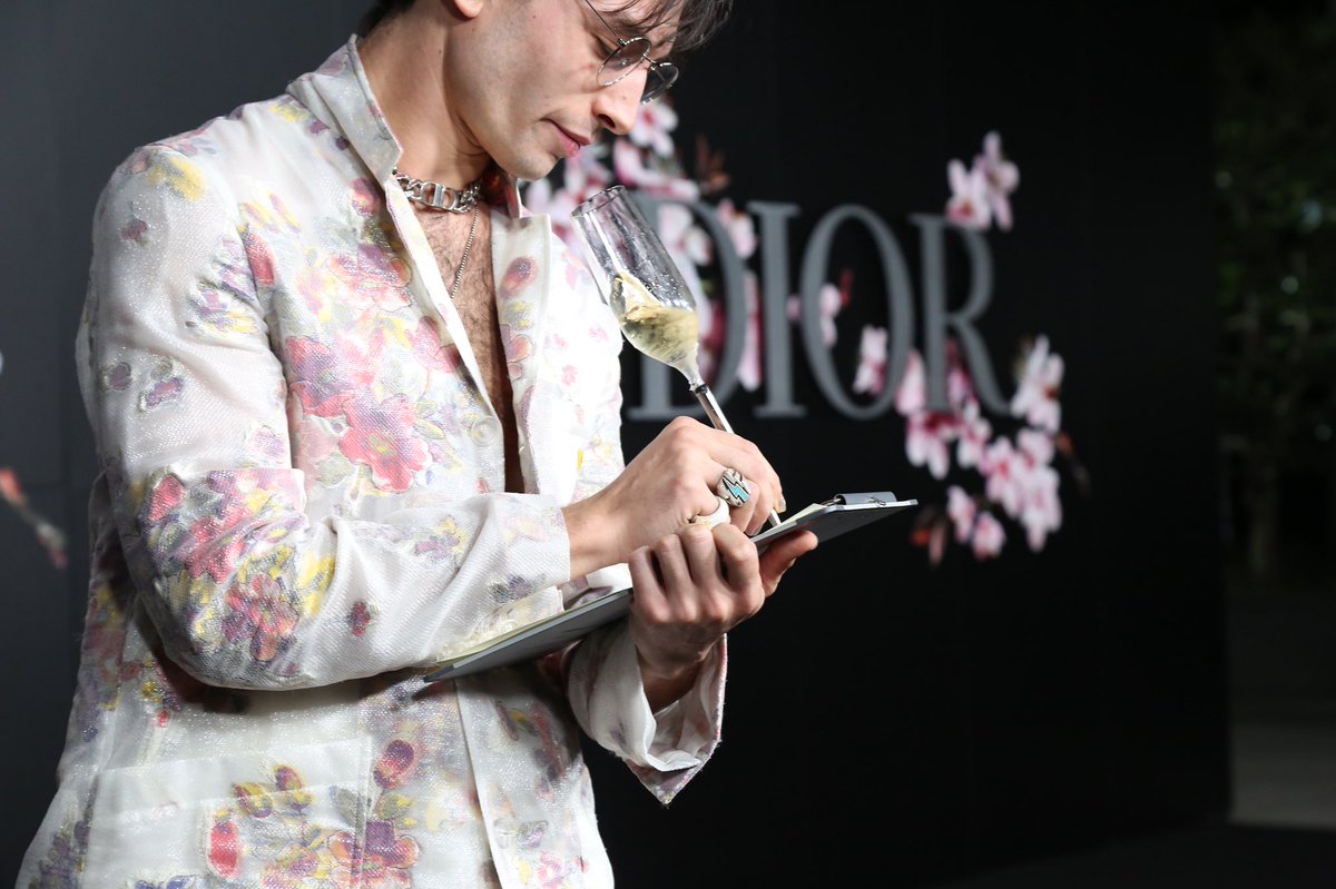 ファンタスティック・ビーストにも出演している俳優のエズラ・ミラーさんも来場✨なんとシャンパングラス(実際にお酒入ってる)型のペンとボードを持参し、何か描いてます😂後でボードを覗いたら、謎の星とDiorの文字を描いてました。。。(笑)最高にチャーミング😂