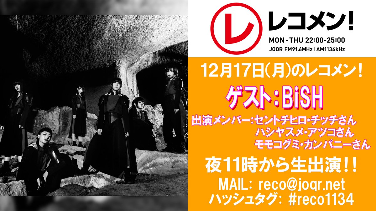 11時台のゲストはBiSHさん(⌒▽⌒)クリスマスにまつわる悲しい俳句を募集中♡11時45分頃からは欅坂46の菅井友香ちゃんとWパーソナリティでお送りしますぜ!お聴き逃しなく♡ #reco1134