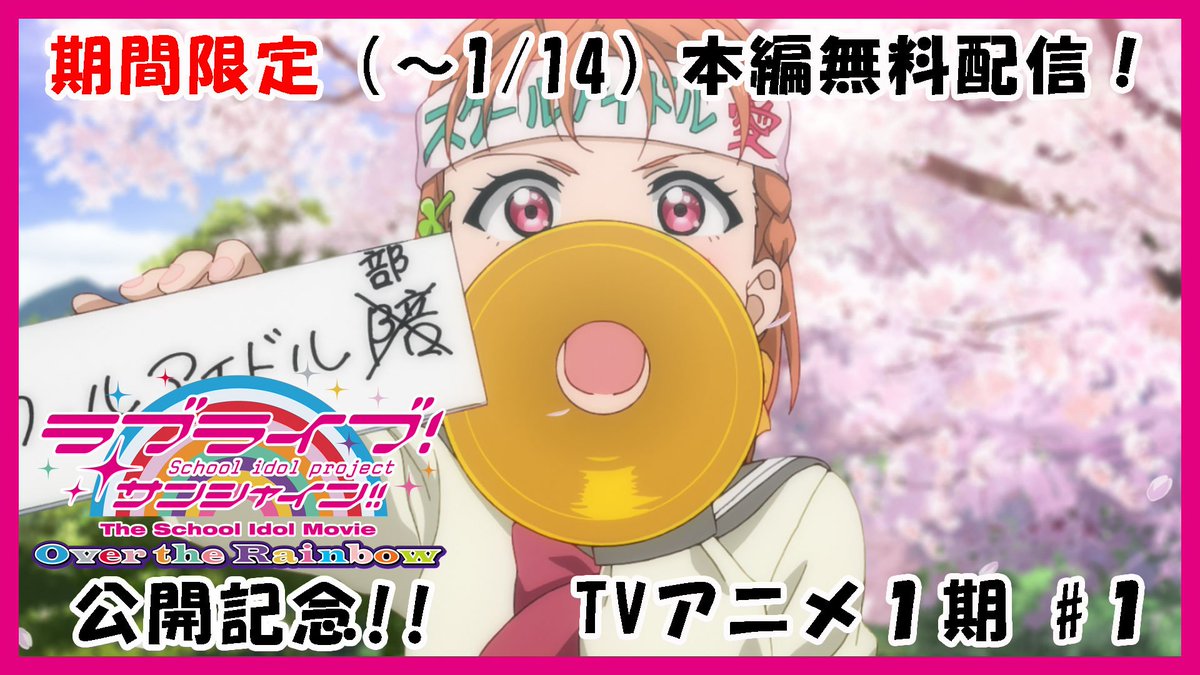 【劇場版公開記念】本日から~1/14の期間限定で、YouTube「ラブライブ!シリーズ公式ch.( youtu.be/XCizC6MG3u4)」およびバンダイチャンネル( b-ch.com/titles/5211/)にて、TVアニメ1期・2期を一挙無料配信!劇場版の予習・復習はもちろん、まだ観たことのない人もこの機会にぜひ! #lovelive pic.twitter.com/YjDcprK2E6