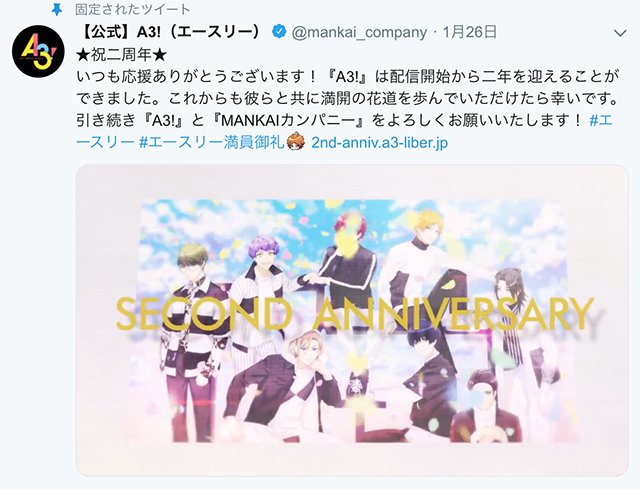 — 【公式】A3!(エースリー) (@mankai_company) 2019年1月27日 21:37
