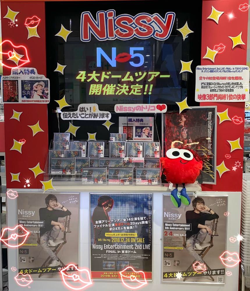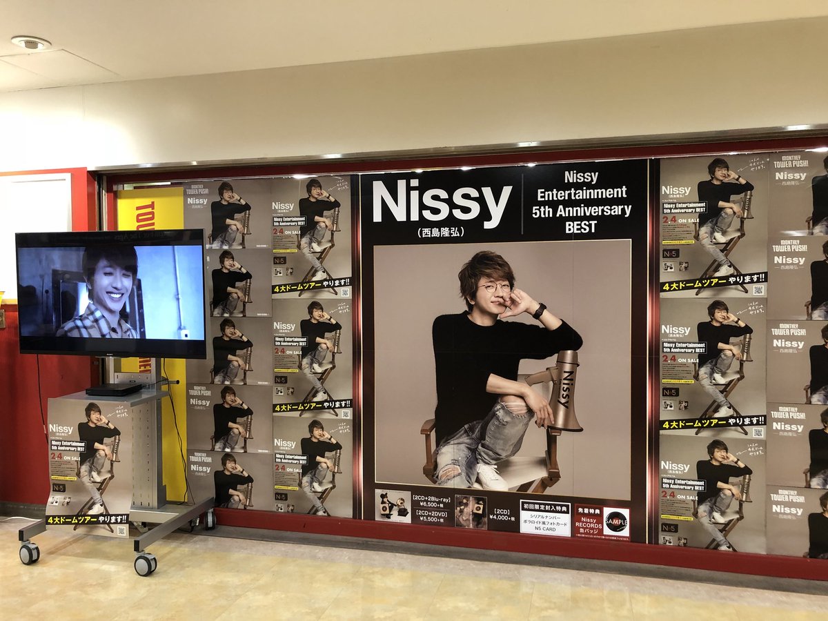 渋谷店も #NissyEntertainment5thAnniversaryBEST 入荷しております💋更にオフィシャルグッズも販売開始💋渋谷店1Fにて大展開中です!!店内も入り口も渋谷店はNissyづくしです💋(MM) #Nissyタワレコ #西島隆弘 pic.twitter.com/AIwUs4T8522019年2月4日 15:59