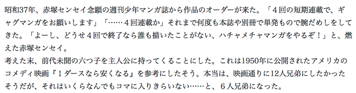 松たちが12人でわちゃわちゃしてるのを見て、赤塚先生が最初にやりたかった「本当は12人描きたかった」という絵面が叶えられたなあなんて思ったりしました