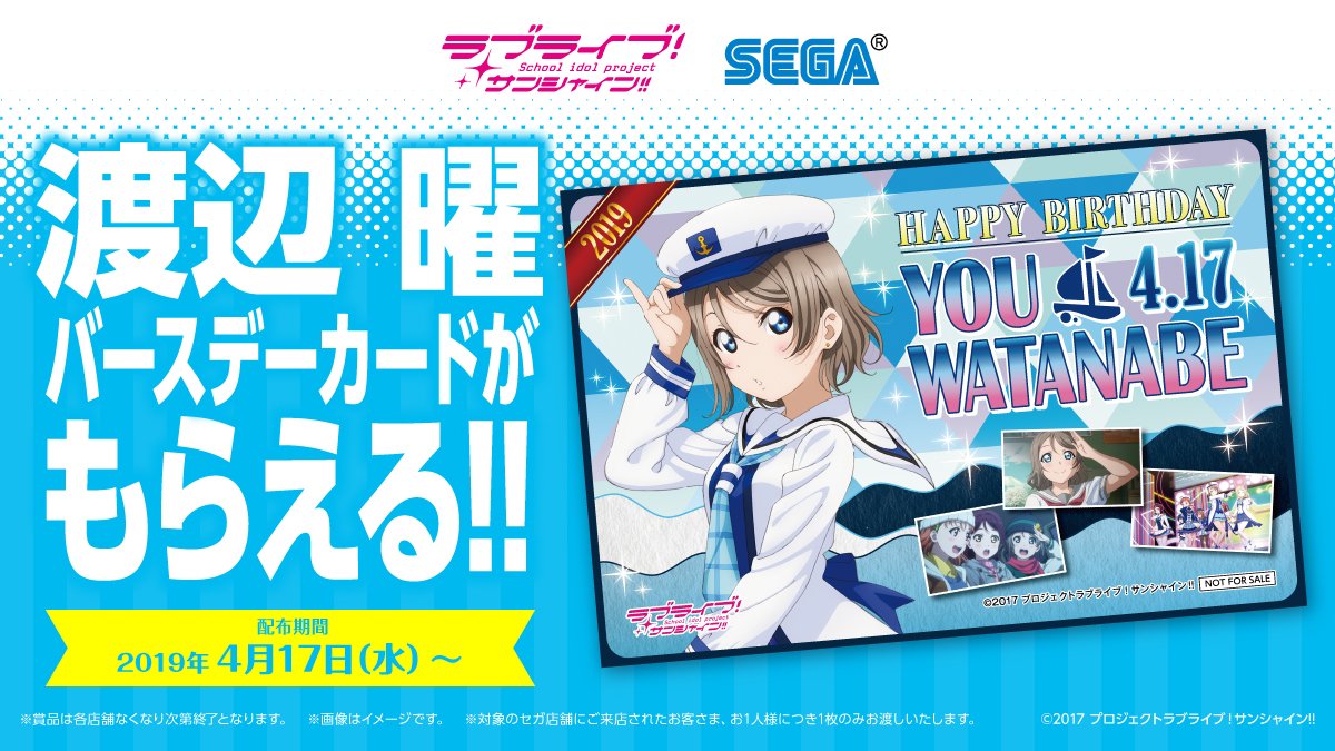 4月17日は渡辺曜さんの誕生日です♪当日は全国のセガのゲームセンターにてバースデーカードをプレゼントします!ぜひお越しください☆ #ラブライブ #lovelive #斉藤朱夏 #渡辺曜生誕祭2019 セガコラボカフェ ラブライブ!も実施中! sega-collabocafe.com/sunshine09.html pic.twitter.com/xffTiix3OE
