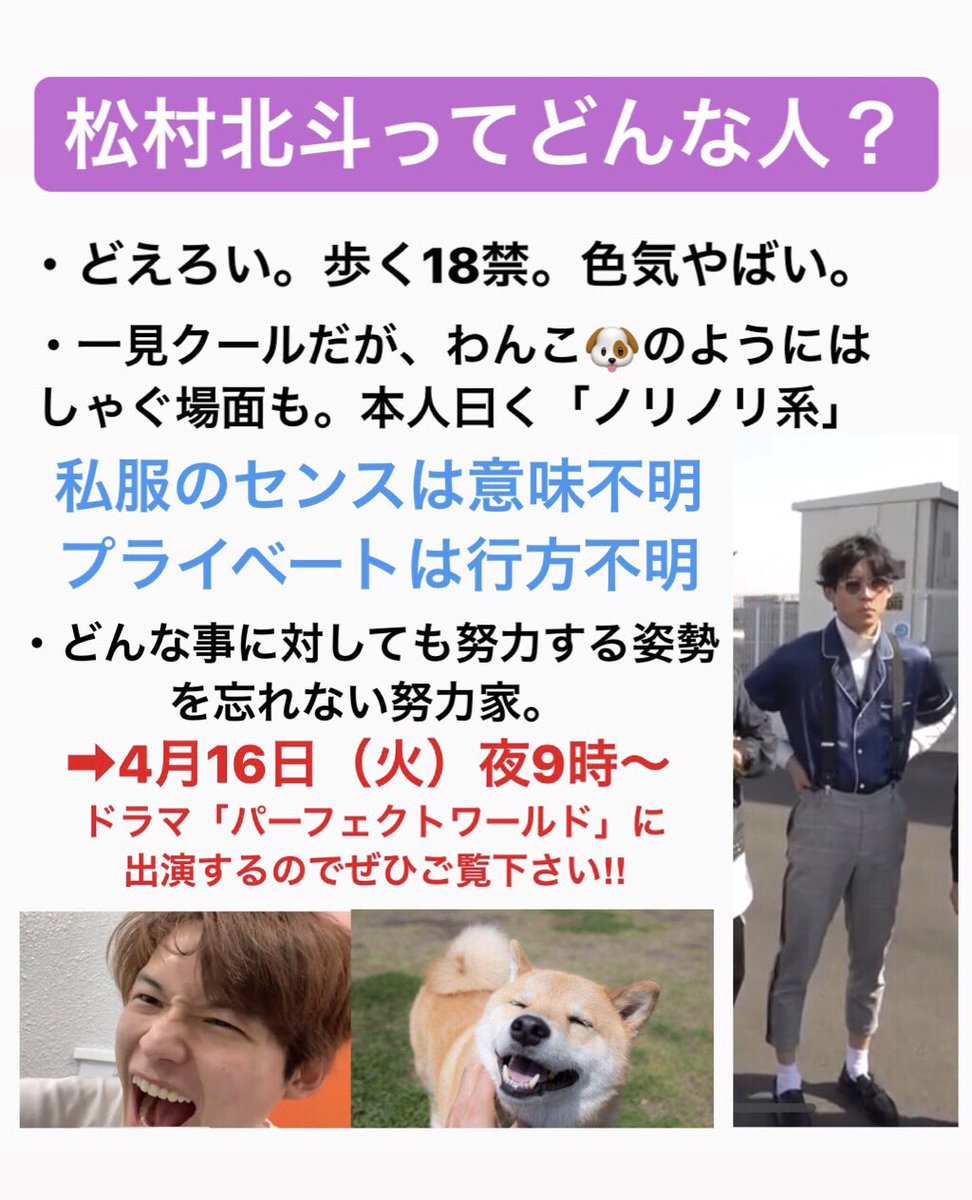 パーフェクトワールドチーム 松村北斗出演中! #SixTONES #松村北斗 pic.twitter.com/EJ1QTlYaM12019年4月1日 19:05