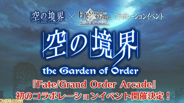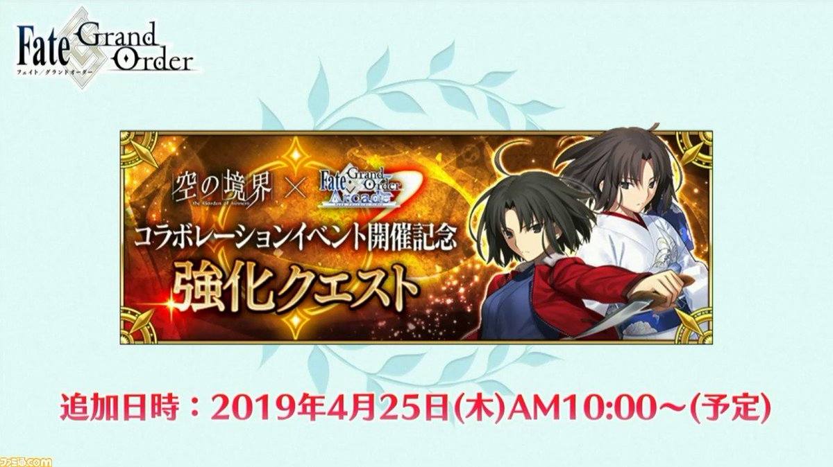 「Fate/Grand Order Arcade カルデア・アーケード放送局 ゴールデンウィーク直前緊急特番」にて、4月25日(木)AM10:00より『FGO Arcade』初のコラボレーションイベント「空の境界/the Garden of Order」の開催を発表!詳しくは→ arcade.fate-go.jp/news/2019-04-2… #FGO #FGOAC pic.twitter.com/WzmQ35H7jw2019年4月24日 22:10
