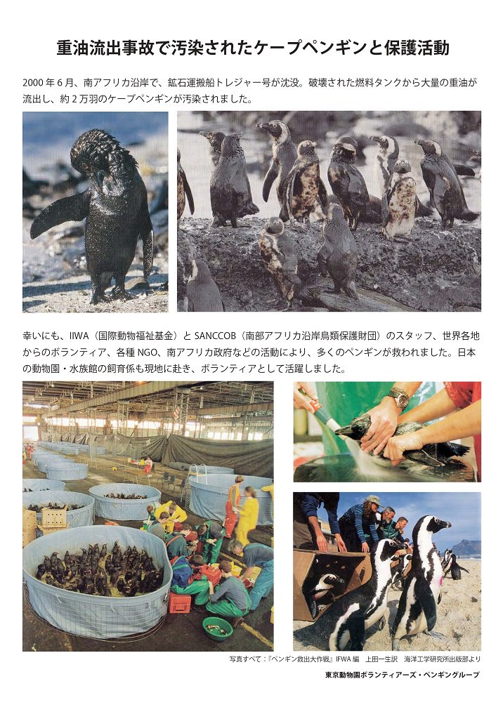 2000年6月には船の沈没による重油流出で、多数のケープペンギンが犠牲になりました。このときペンギンたちを助けたのは、世界各国から集まったボランティア。日本の動物園・水族館飼育係もボランティアに参加しています。