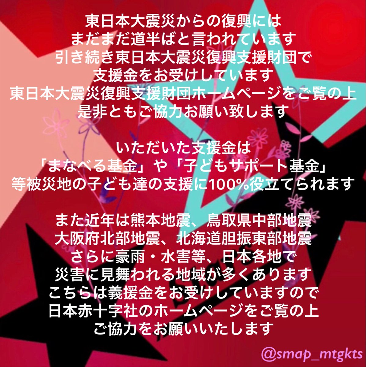 大事なのは続けること 自分の出来る事をこれからも #SMAP #スマスマ #義援金にご協力お願いします #復興支援 #復興に向けてを手を繋ごう #新しい地図