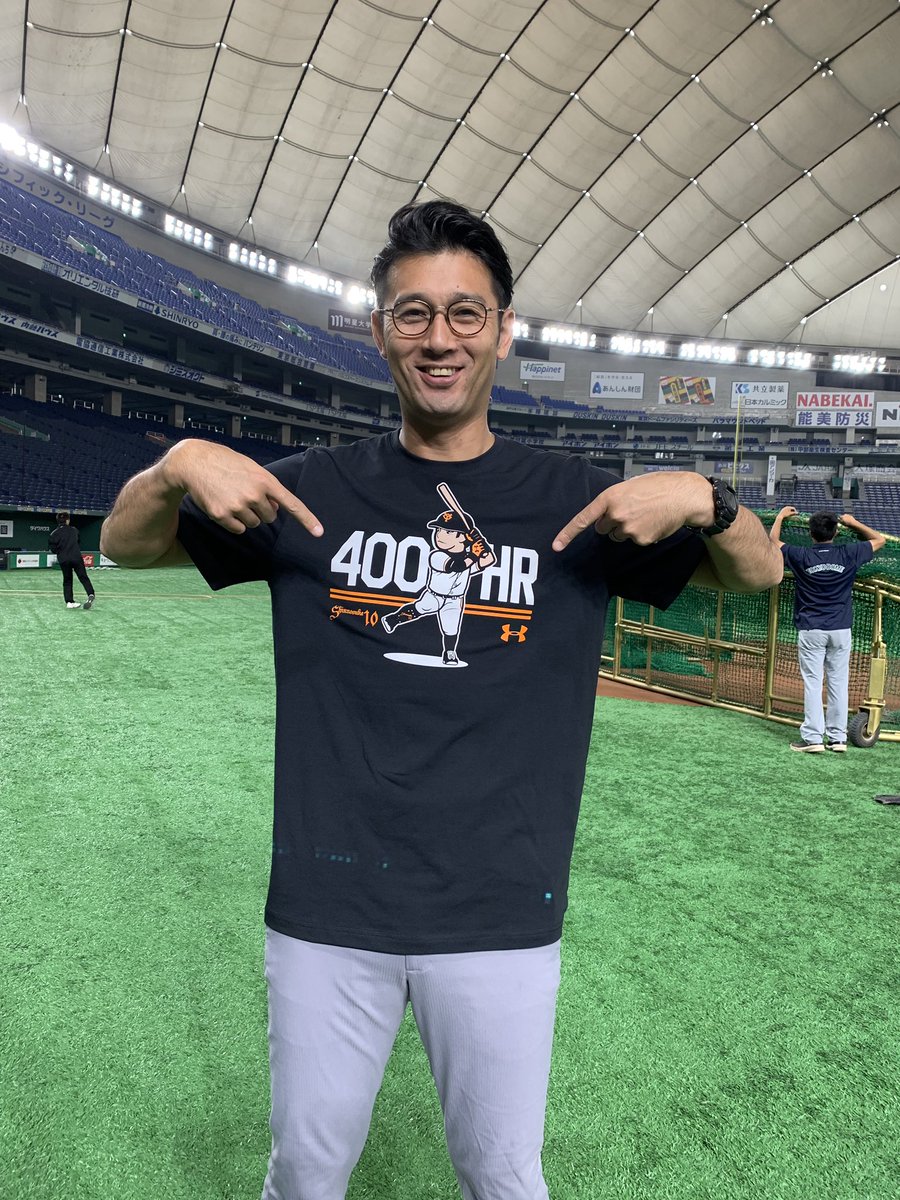 #阿部慎之助 選手の400本塁打㊗️🎉達成を記念して、今日はチーム関係者の方々が記念Tシャツを着用しています!こちらはアンダーアーマークラブハウス東京ドーム店では本日より先行発売、ECサイトでは4日(火)から。お値段は5400円(税込)だそうです。写真は爽やかにキメる #矢貫俊之 広報✨ pic.twitter.com/HXcJuHphWs