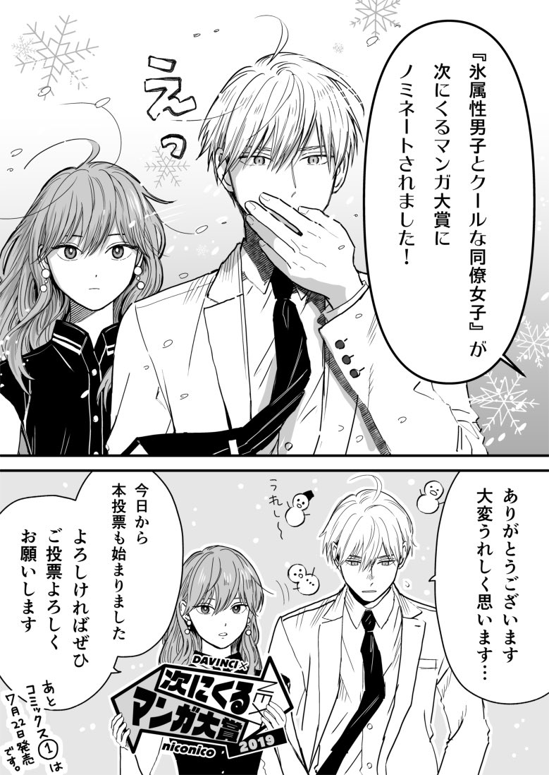 【お知らせ】『氷属性男子とクールな同僚女子』が「次にくるマンガ大賞」Webマンガ部門にノミネートされました!推薦して下さった皆さまありがとうございます~✨