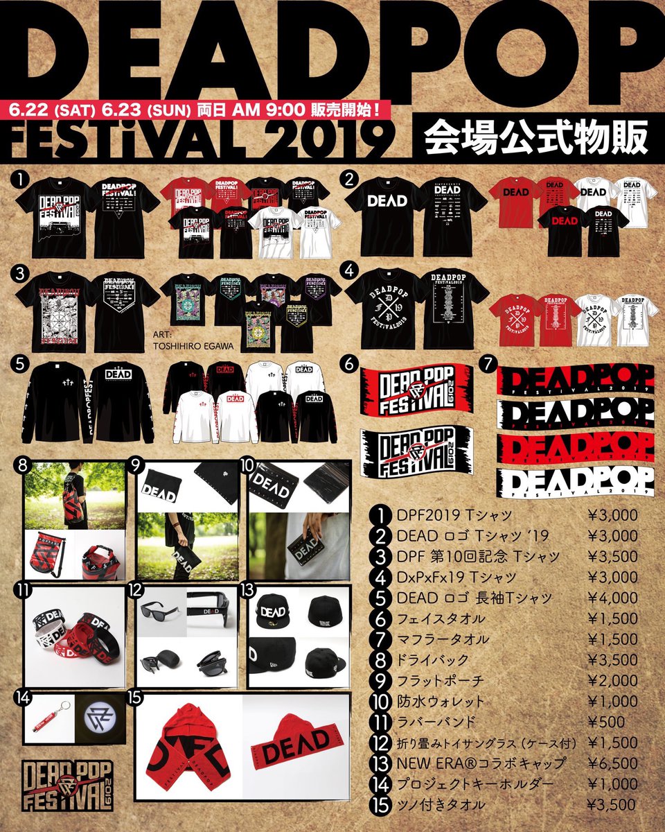 本日のDEAD POP FESTiVAL2019オフィシャルグッズは9:00より販売開始です!数量に限りがあるのでお早めに! #DPF2019 pic.twitter.com/p4MGEOiRoj2019年6月23日 07:44