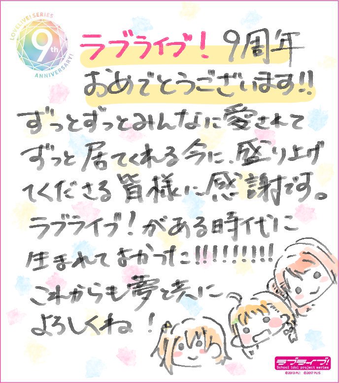 記念すべきラブライブ!シリーズ9周年スタートとなる本日、みなさんの熱い想いを感じることができ、とても嬉しく感謝の気持ちでいっぱいです。これからもたくさんの夢をみんなで叶えていきましょう!