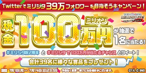 【ミリシタ】Twitterでミリシタ39万フォロワーを目指そうキャンペーン!抽選で1名に100万円が当たるチャンス!→→ is.gd/8A8phT #idolmaster #ミリシタ #ミリシタ祝2周年 #ミリシタで100万円が当たるチャンス pic.twitter.com/XkfNPtKFIi