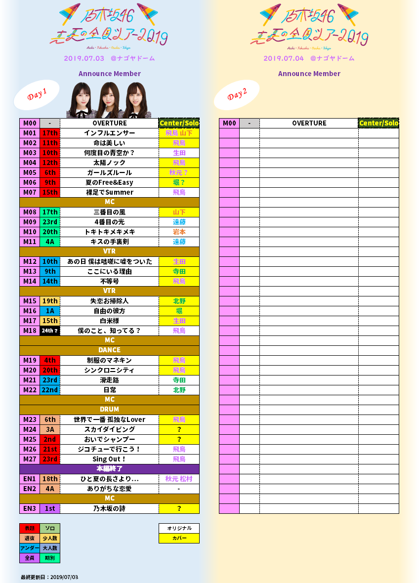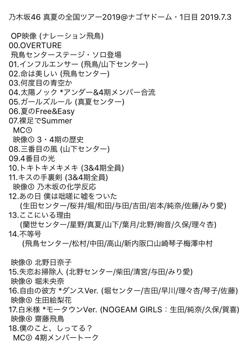 乃木坂46 真夏の全国ツアー2019 @ ナゴヤドーム・1日目 2019.7.3 全セットリスト #乃木坂46 #真夏の全国ツアー2019 #真夏の全国ツアー #nogizaka46 pic.twitter.com/pwQmeQlZhN