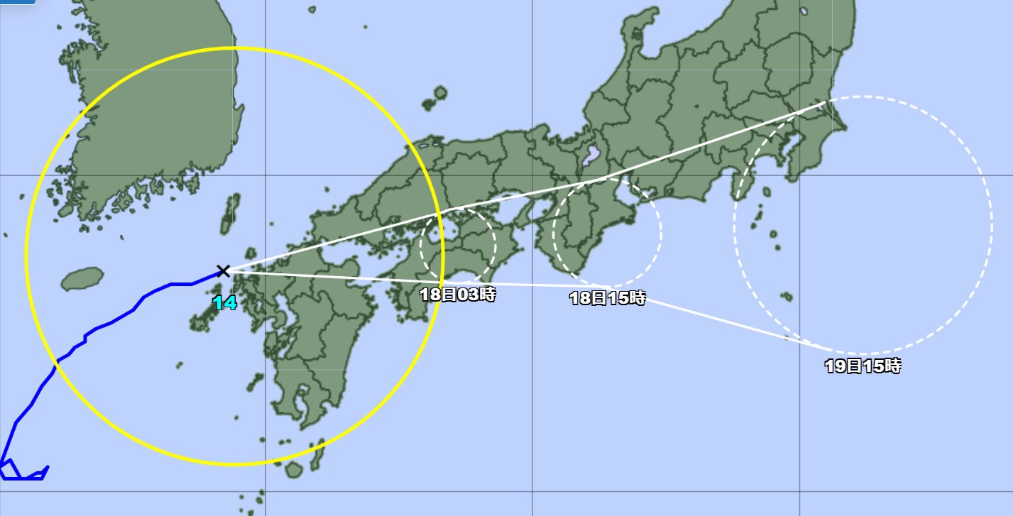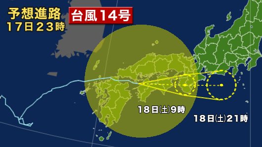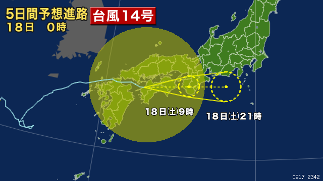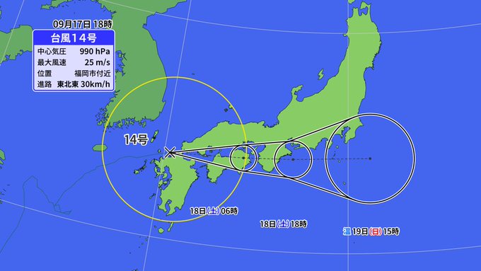 本日午後以降に、#台風14号 が西日本上陸の見込みです。