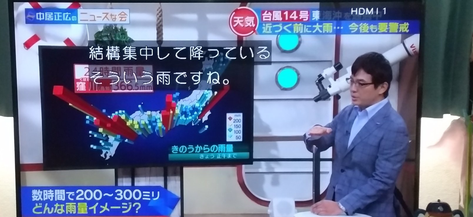 24時間366mmの雨量って実はよくわからないところを中居MCがスルーせずに追及w 「しみ込まなければ36cmくらいの雨がたまった状態」って格段にわかりやすくなった。