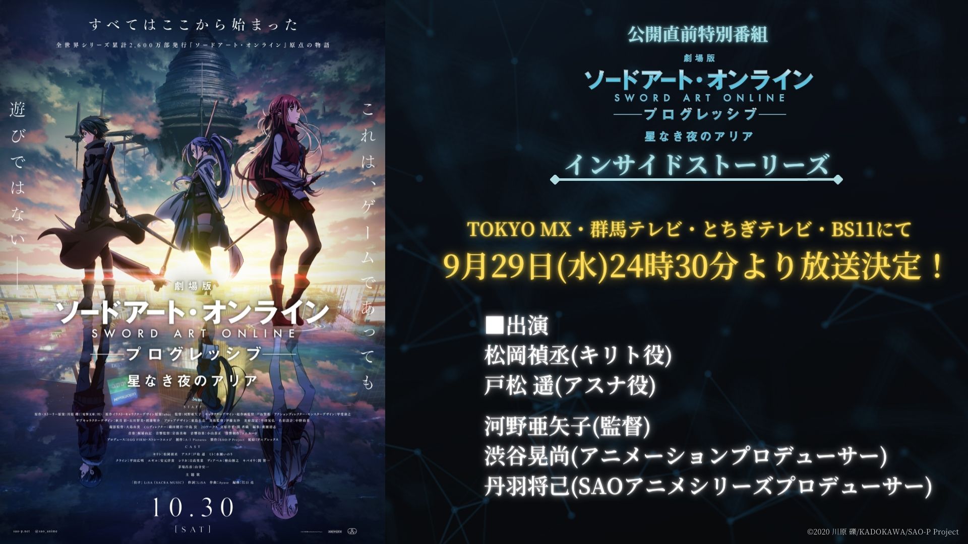 次週9/29(水)24:30からは、TOKYO MX・とちぎテレビ・群馬テレビ・BS11にて『劇場版 SAO プログレッシブ 星なき夜のアリア』の特別番組を放送いたします!