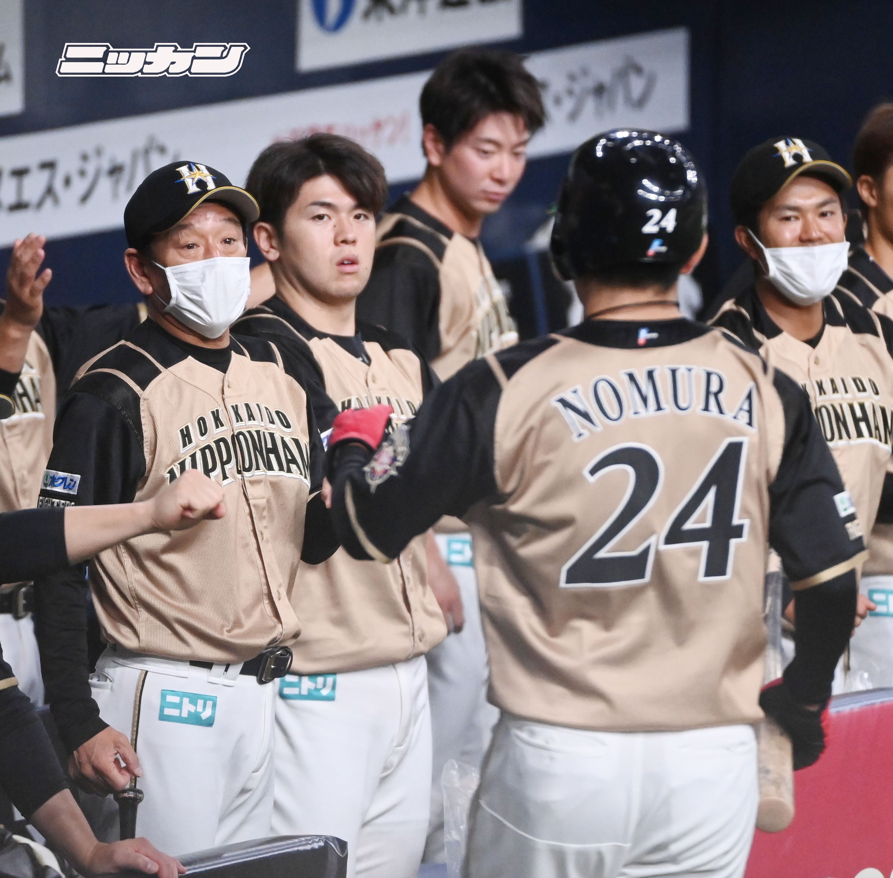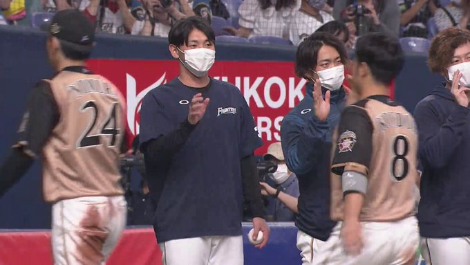 試合前のピックアップ選手 #野村佑希 選手が追加点を放ち、勝利に貢献しました!ベンチで出迎える #栗山英樹 監督らチームメート👐 #今川優馬 選手のマスク越しからも分かる嬉しそうな表情が印象的です✨