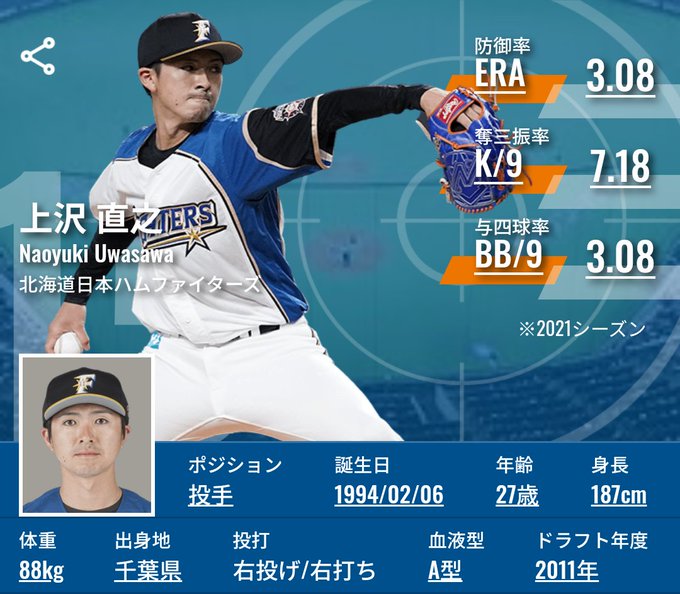 ◆選手名鑑で上沢投手の動画/ニュース/成績をチェック!