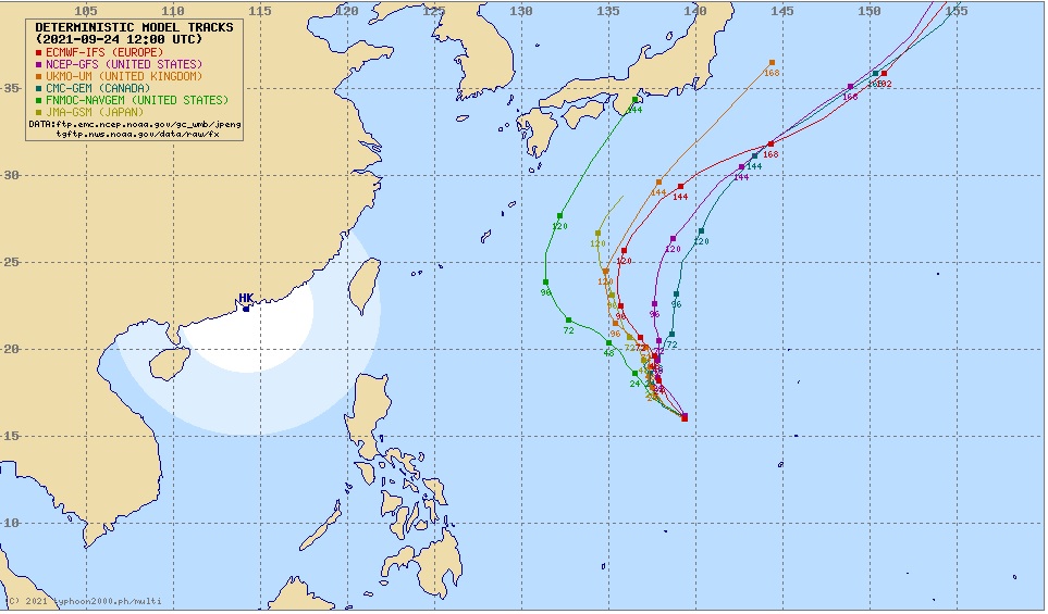 昨夜の各国の気象モデルは米国海軍NAVGEMを除いて日本の南海上で東に転向させて本州に接近しない計算結果に。大陸からの気圧の谷に乗っかっています。これだと本州には高波は押し寄せますが、被害はほとんどなく済みます #台風16号 #空ネット